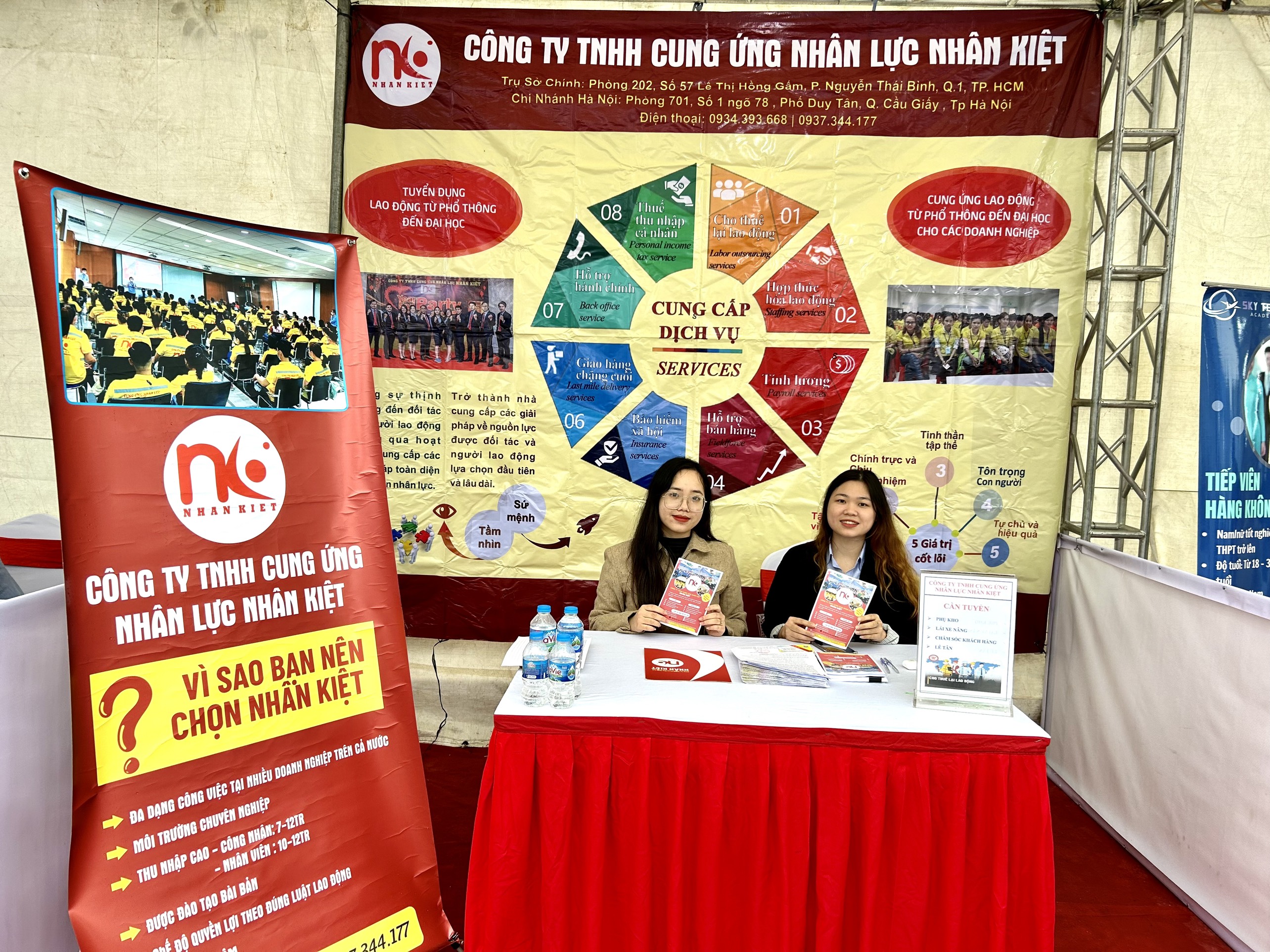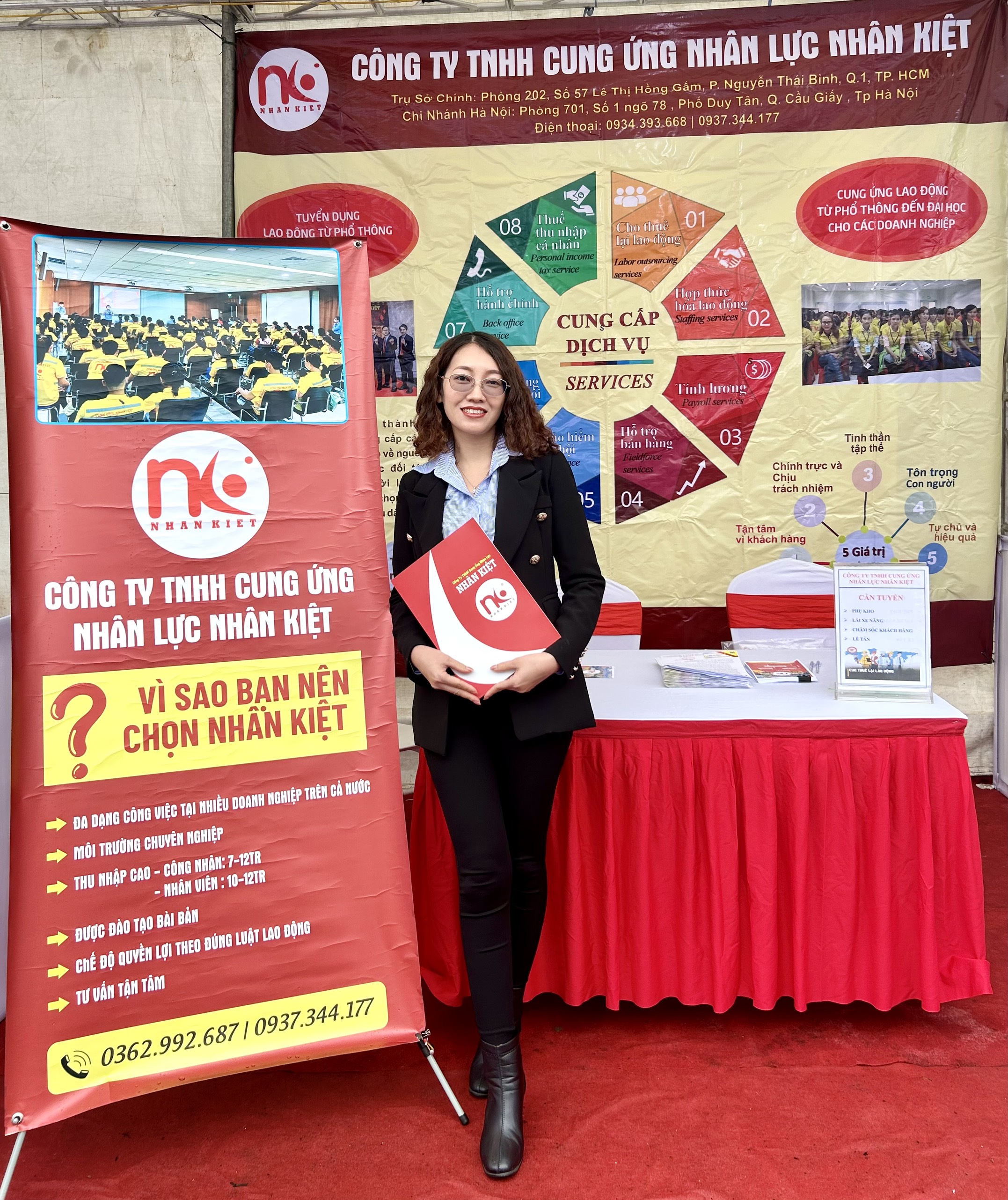Nhân Kiệt đồng thời tham gia tư vấn tuyển dụng đa ngành nghề cho người lao động, phổ biến các chế độ đãi ngộ hấp dẫn. Chị Phạm Thị Tâm – Giám đốc kinh doanh khu vực Hà Nội Công ty TNHH Cung ứng nhân lực Nhân Kiệt chia sẻ về lĩnh vực hoạt động của công ty, thông tin về quá trình hình thành và phát triểnm cũng như các vị trí việc làm mà Công ty tuyển dụng như hơn 2.000 lao động phổ thông làm trong các nhà máy sản xuất linh kiện điện tử, kho vận… Mức lương cơ bản của công nhân sản xuất từ 5 – hơn 6 triệu đồng/tháng; cộng với phụ cấp thâm niên, xăng xe, chuyên cần, ăn gữa ca, tăng ca thì thu nhập 9 – 10 triệu đồng/tháng. Ngoài ra, người lao động còn có tháng lương 13, tiền lễ tết, nghỉ phép năm và các chế độ bảo hiểm xã hội.