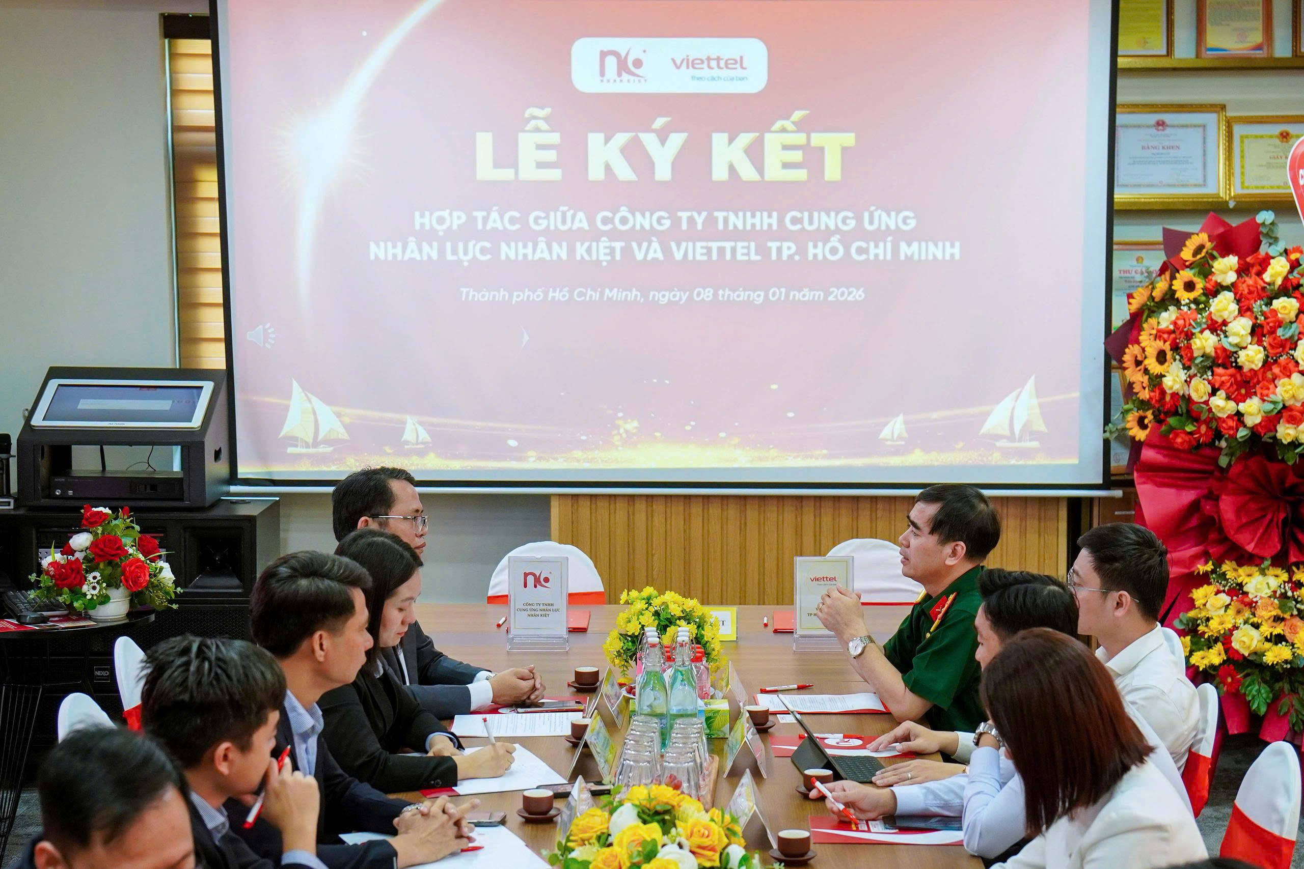 Ngày 08/01/2026, tại Thành phố Hồ Chí Minh, Công ty TNHH Cung Ứng Nhân Lực Nhân Kiệt và Viettel TP. Hồ Chí Minh đã chính thức ký kết hợp tác nhằm phối hợp phát triển khách hàng và triển khai các giải pháp Công nghệ thông tin – Viễn thông – Chuyển đổi số, qua đó góp phần nâng cao năng lực quản trị, tối ưu hóa hoạt động vận hành và thúc đẩy quá trình số hóa nguồn nhân lực trong doanh nghiệp.