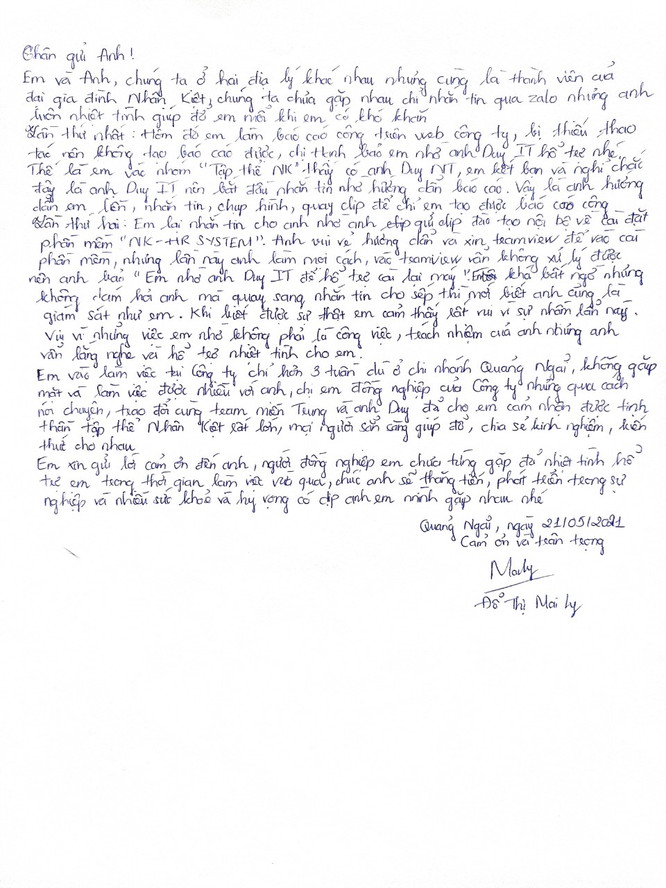 Qua đây tôi cũng muốn gửi riêng 1 bức thư cám ơn đến anh “Duy IT_nhầm lẫn”, người đã cho tôi bài học rất lớn về tinh thần tập thể. Tôi muốn gửi lời cám ơn chân thành đến anh, đến công ty vì đã giúp tôi hòa nhập vào văn hóa mới của công ty một cách dễ dàng và không thấy khó khăn, áp lực vì là người mới. Như một sự kế thừa, tôi sẽ cố gắng lan tỏa giá trị văn hóa này đến với các bạn trong team, sẽ luôn giúp đỡ hỗ trợ khi tôi có thể. Trân trọng cám ơn!