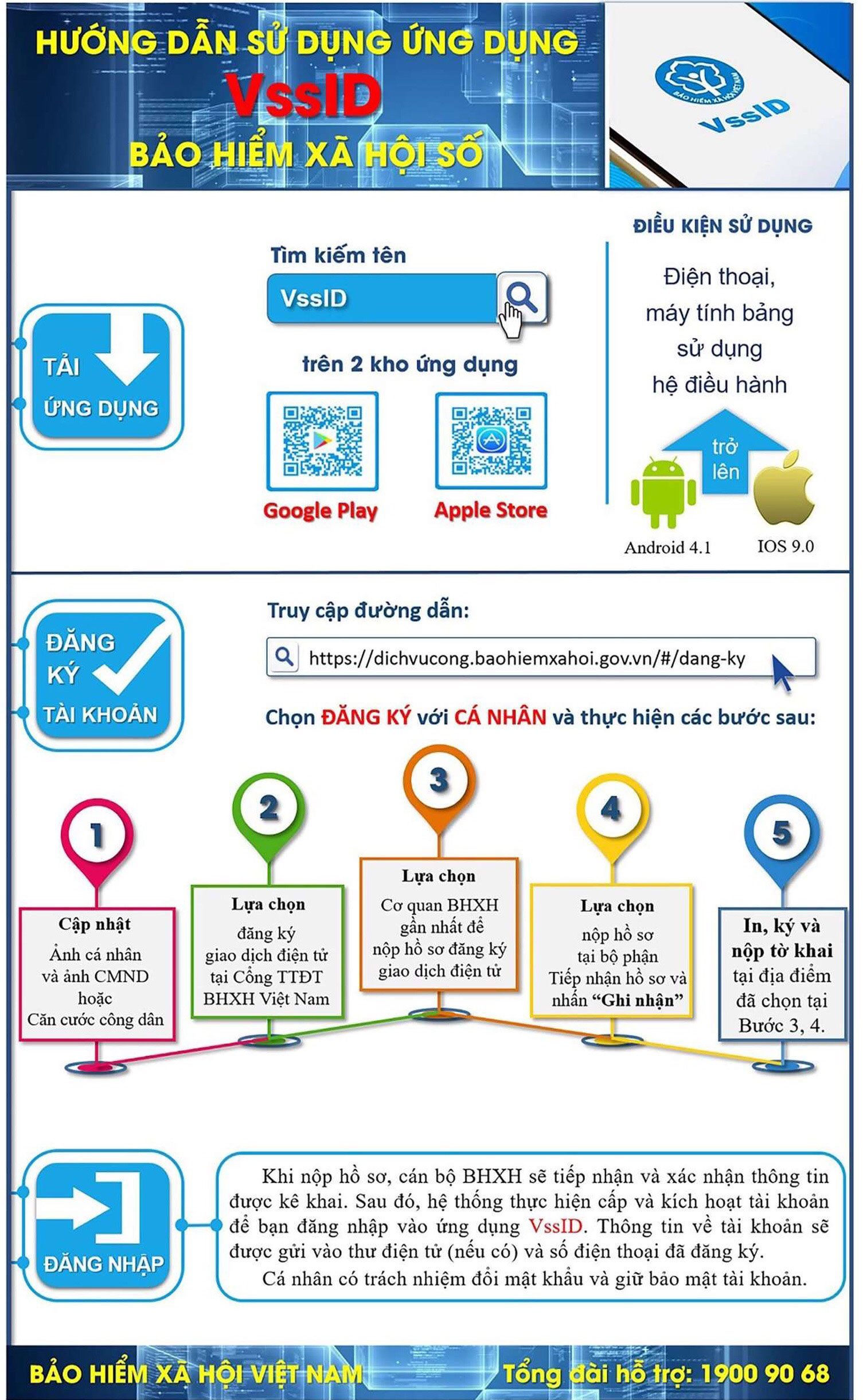 VssID là ứng dụng trên nền tảng thiết bị di động của BHXH Việt Nam đã được cung cấp trên Google Play cho thiết bị sử dụng hệ điều hành Android, AppStore và thiết bị sử dụng hệ điều hành IOS của Apple. Ứng dụng này giúp thiết lập kênh giao tiếp và tạo điều kiện cho người tham gia BHXH, BHYT tiếp cận thông tin, thực hiện các dịch vụ công một cách tiện lợi, dễ dàng, nhanh chóng nhất, từng bước thực hiện việc thay thế sổ BHXH, thẻ BHYT giấy như hiện nay.