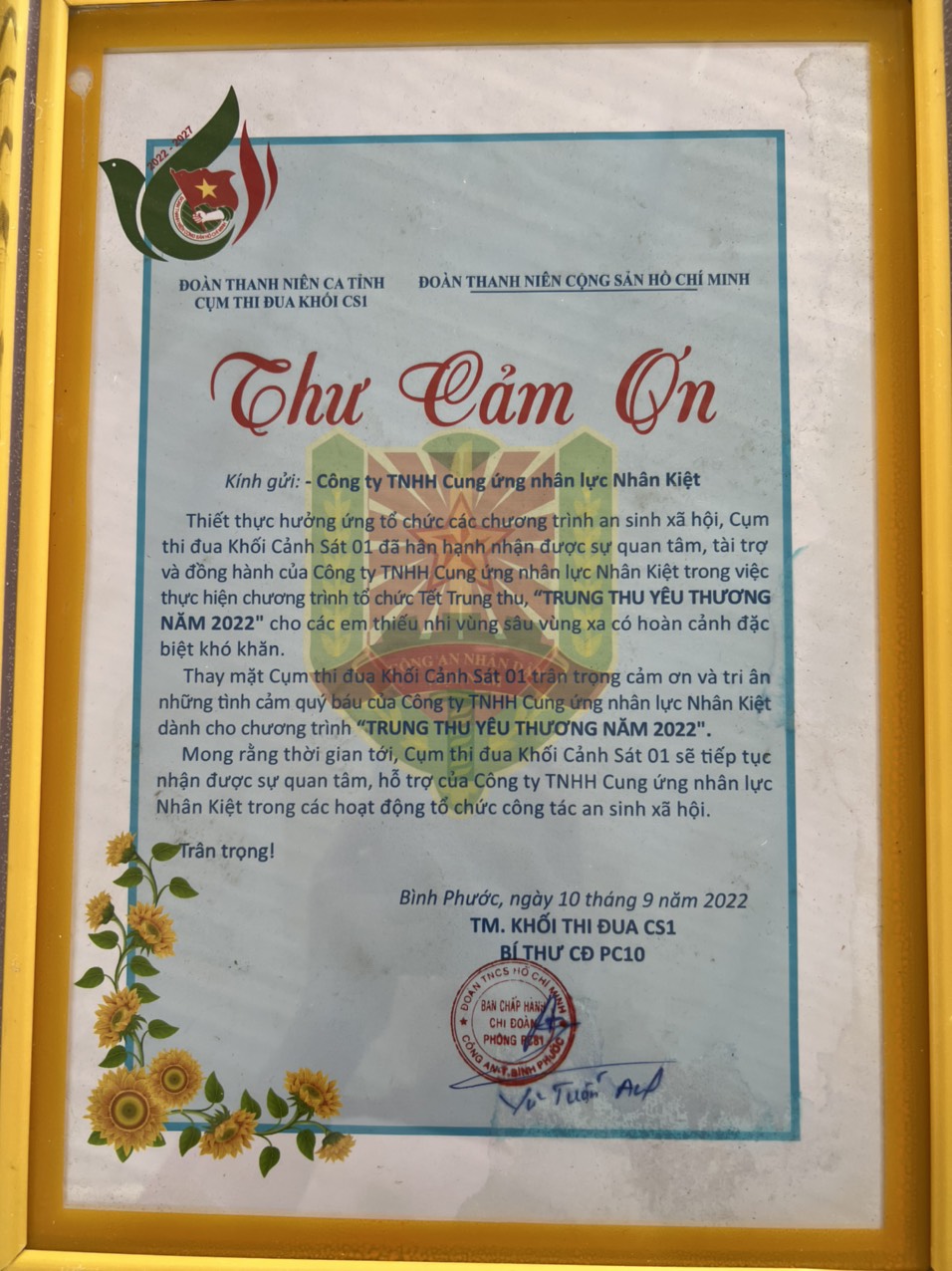 Hoà mình vào trong không khí vui nhộn ấy vào ngày 10-11/09/2022 Nhân Kiệt đã đồng hành chương trình "Trung Thu yêu thương" cùng với ĐTN khối thi đua cụm CS1 - Hội phụ nữ khối CS LHHC - ĐTN Becamex Bình Phước - Câu lạc bộ Hoa Hướng Dương - Bệnh viện Nhân Dân Gia Định, TTXTĐT, TM và DL Bình Phước xây dựng lên 1 chương trình thật sâu sắc và ý nghĩa ở trường Tiểu học và THCS Lộc Thành, Lộc Ninh, Bình Phước.