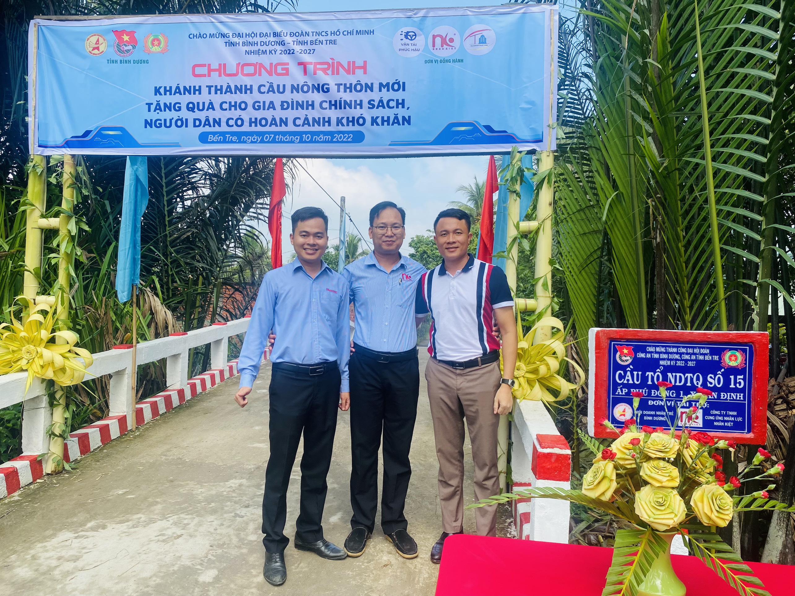 Sáng ngày 07/10/2022, Công ty TNHH Cung ứng Nhân lực Nhân Kiệt cùng với Hội Doanh Nhân Trẻ tỉnh Bình Dương, Đoàn TN Công An tỉnh Bình Dương và Đoàn TN Công An tỉnh Bến Tre phối hợp tổ chức chương trình Khánh thành cây cầu nông thôn mới ở Ấp Phú Đông 1, xã An Định, huyện Mỏ Cày, tỉnh Bến Tre.