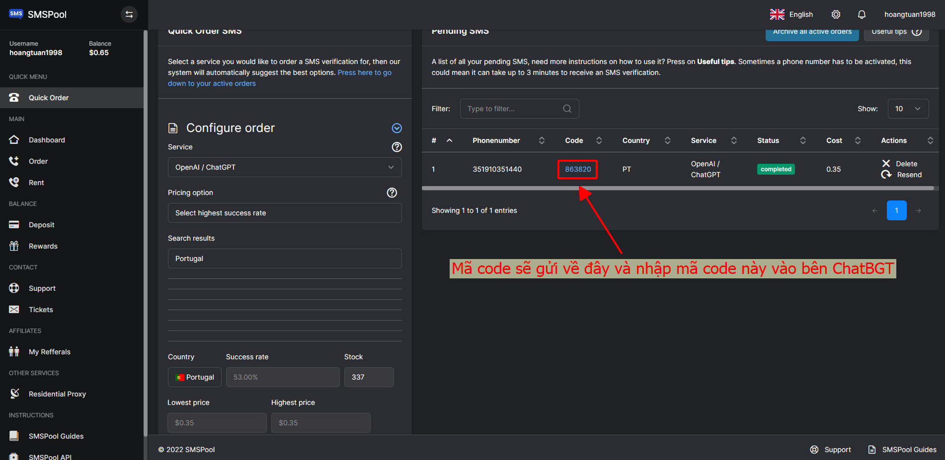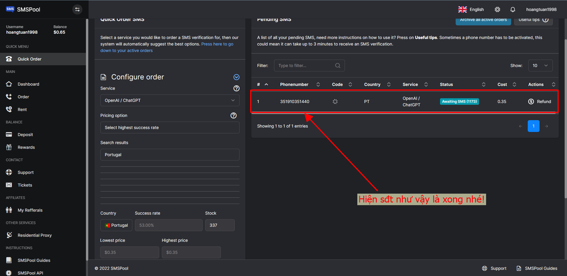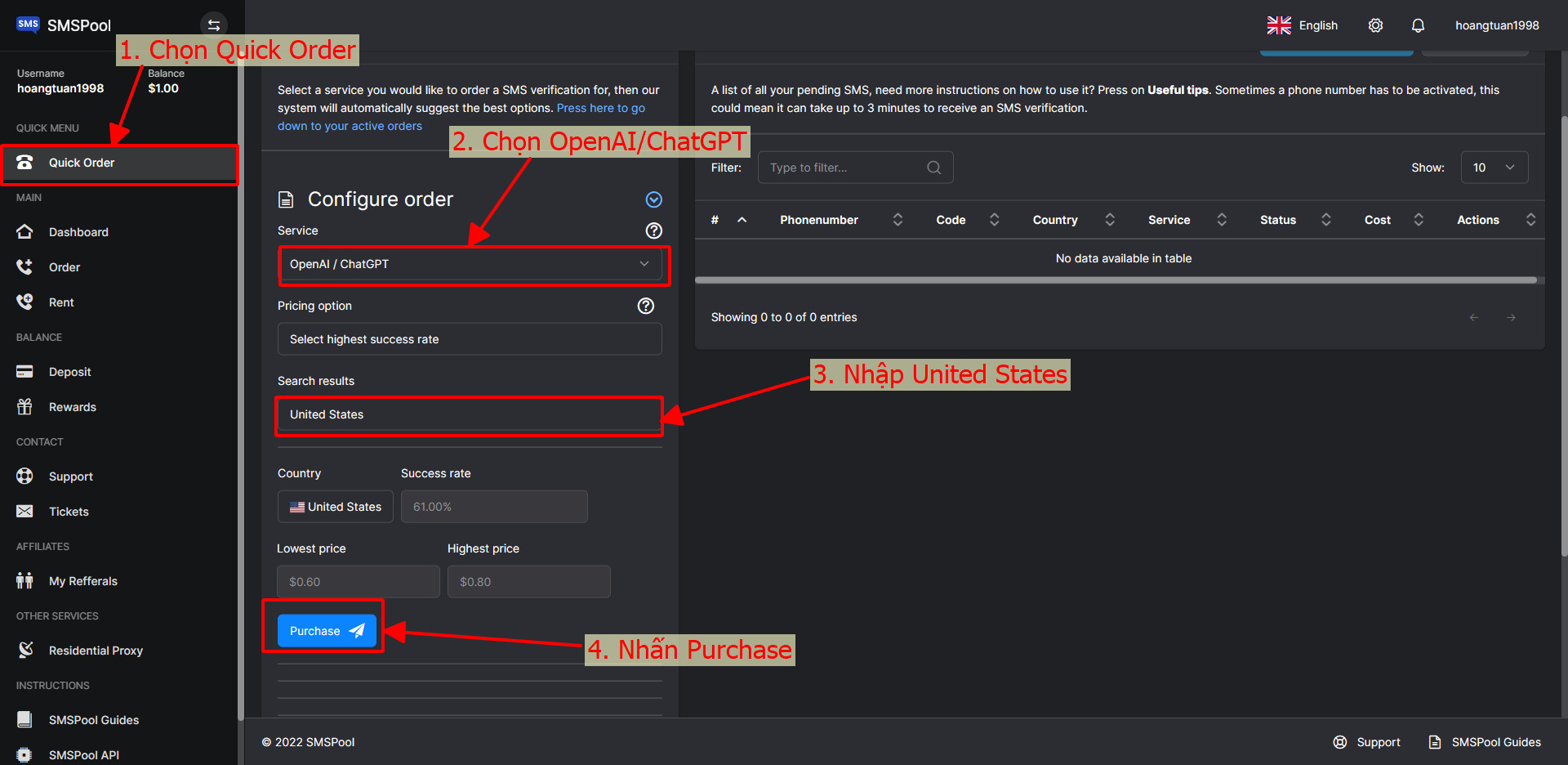 Bước 7: Sau khi đã tiến hành thanh toán, thì bạn hãy quay lại trang chính bằng cách cập nhật lại URL > tại gia diện chính bạn hãy chọn vào mục Quick Order dưới tên tài khoản của mình và số tiền đã nạp > chọn vào mục OpenAI/ChatGPT > chọn tiếp ở mục Pricing Option là Select highest success rate > chọn quốc gia là United > sau đó kéo xuống dưới chọn mục Purchase để thực hiện thanh toán mua số điện thoại ảo là xong.