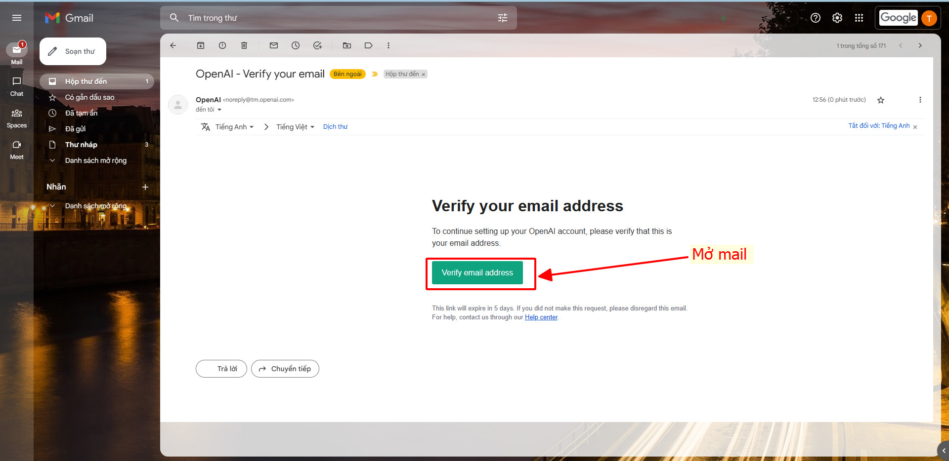 Bước 3: Bạn vào hộp thư đến mở mail của OPenAI gửi tới, sau đó nhấn xác nhận Verify email address.