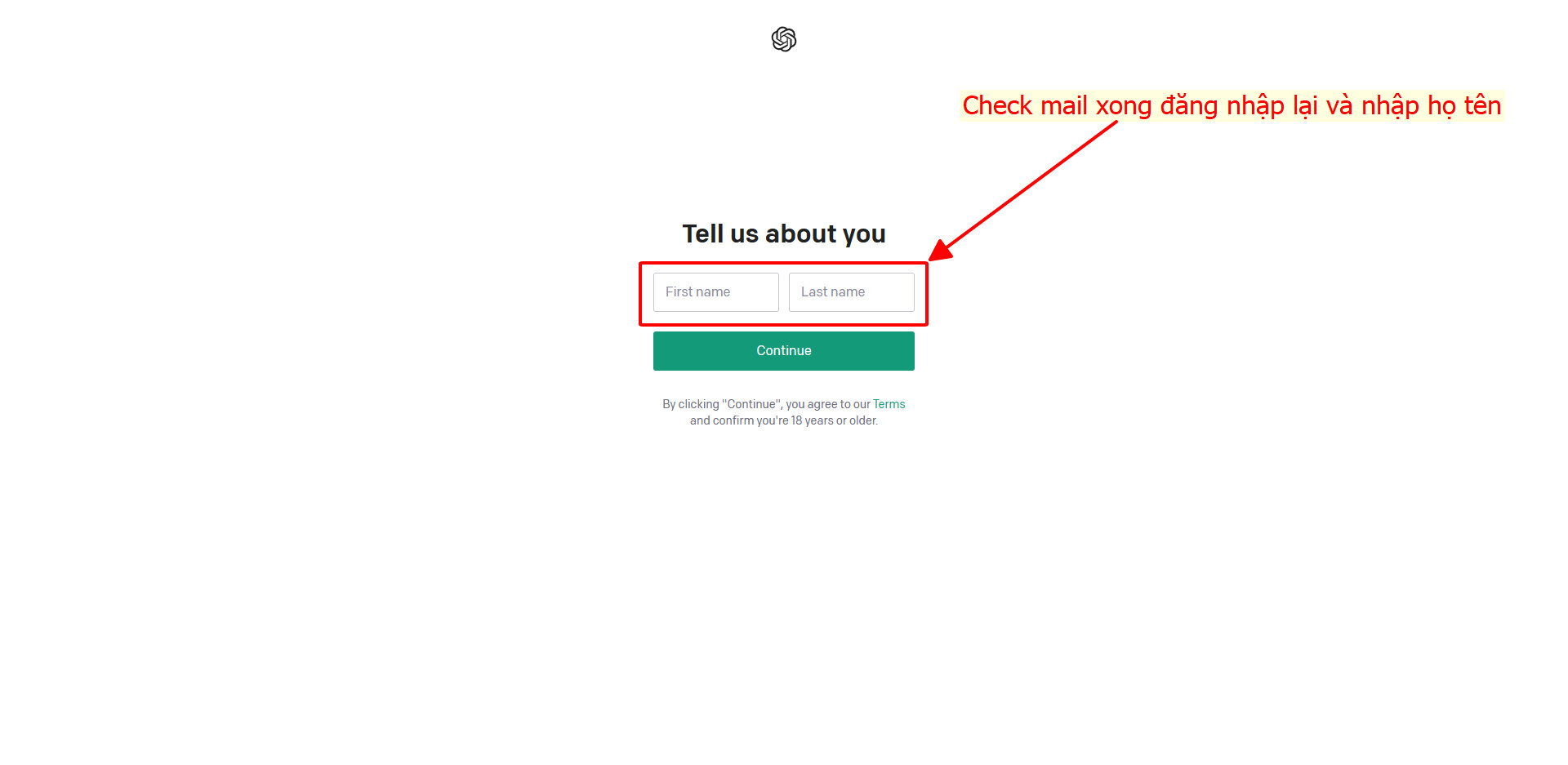 Bước 4: Đăng nhập lại https://chat.openai.com/ : Nhập đầy đủ họ và tên như hình hướng dẫn