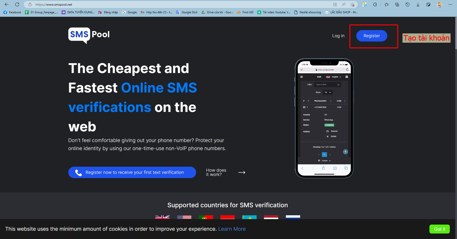 Bước 1: Đầu tiên, bạn cần phải đăng ký tài khoản smspool bằng cách truy cập tại đường link https://www.smspool.net/.