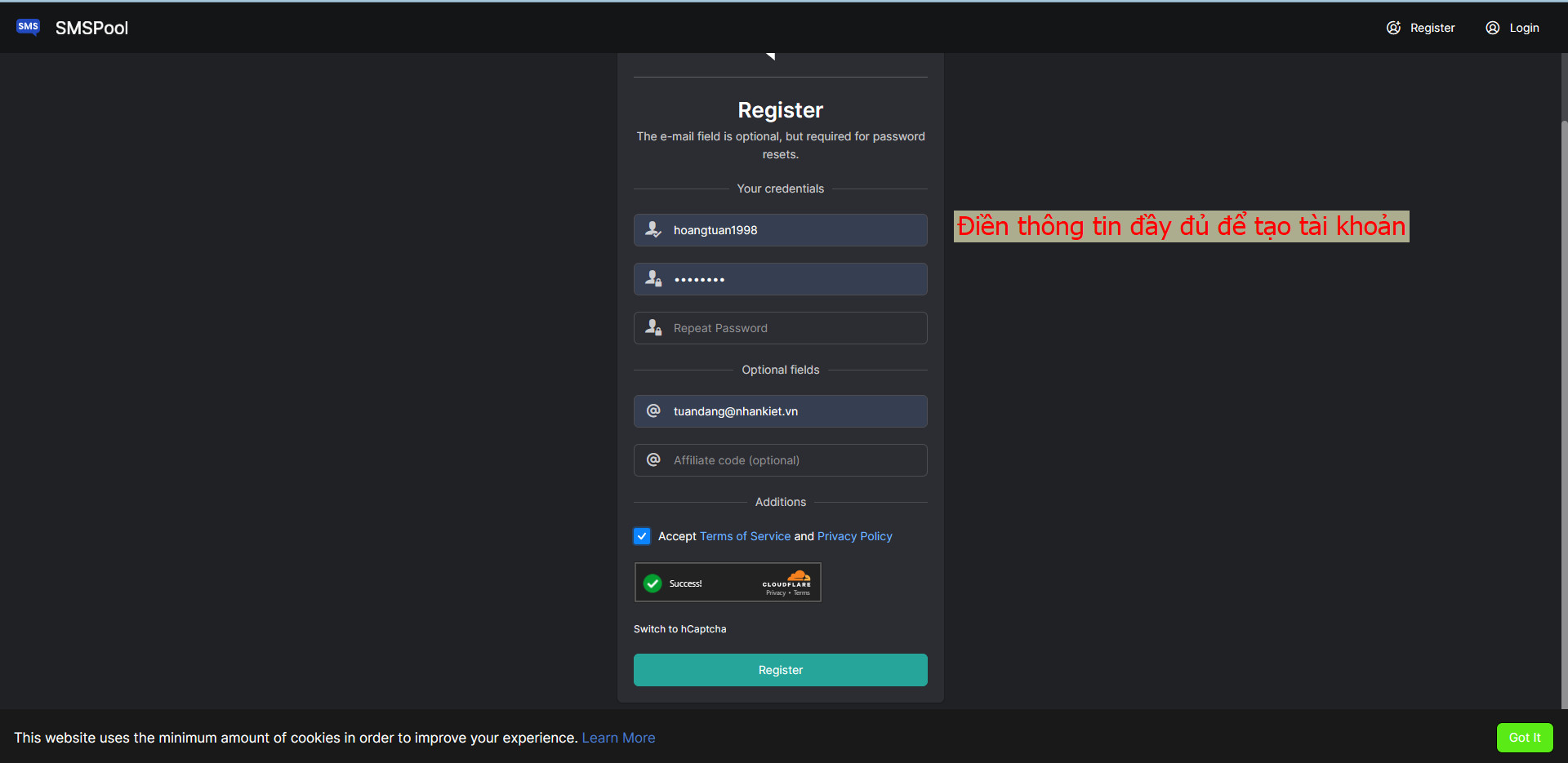 Bước 4: Sau đó hãy tích chọn vào mục Accept Terms of Service and Privacy Policy > chọn tiếp vào Register để đồng ý tạo tài khoản > rồi tiến hành đăng nhập tài khoản mới tạo.
