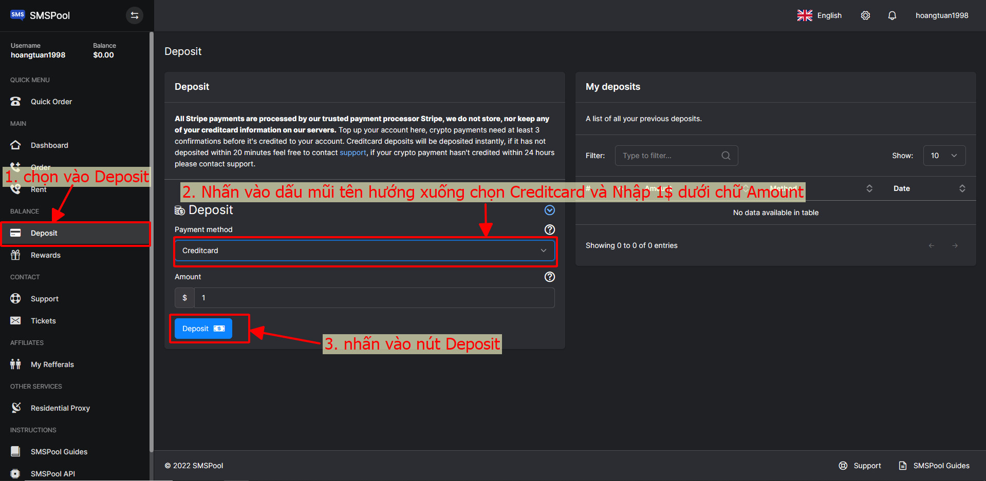 Bước 5: Sau đó bạn cần tiến hành nạp tiền để có thể thuê số điện thoại ảo > bấm chọn vào mục Deposit > kế đến chọn vào mục Credit Card