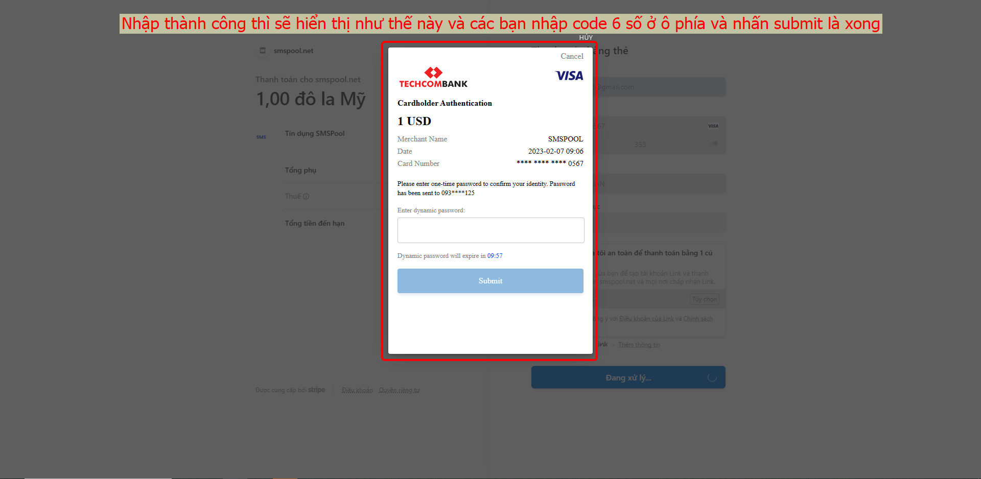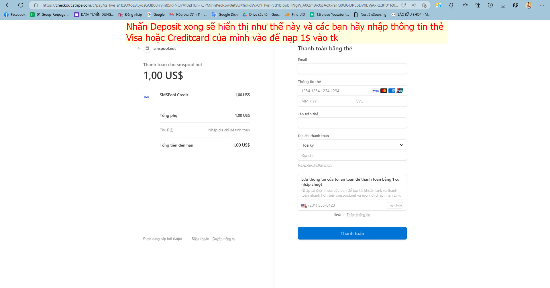 Bước 6: Bạn cần thanh toán 1$ để tiến hành thuê số điện thoại ảo, nhập thông tin thẻ để thực hiện thanh toán.