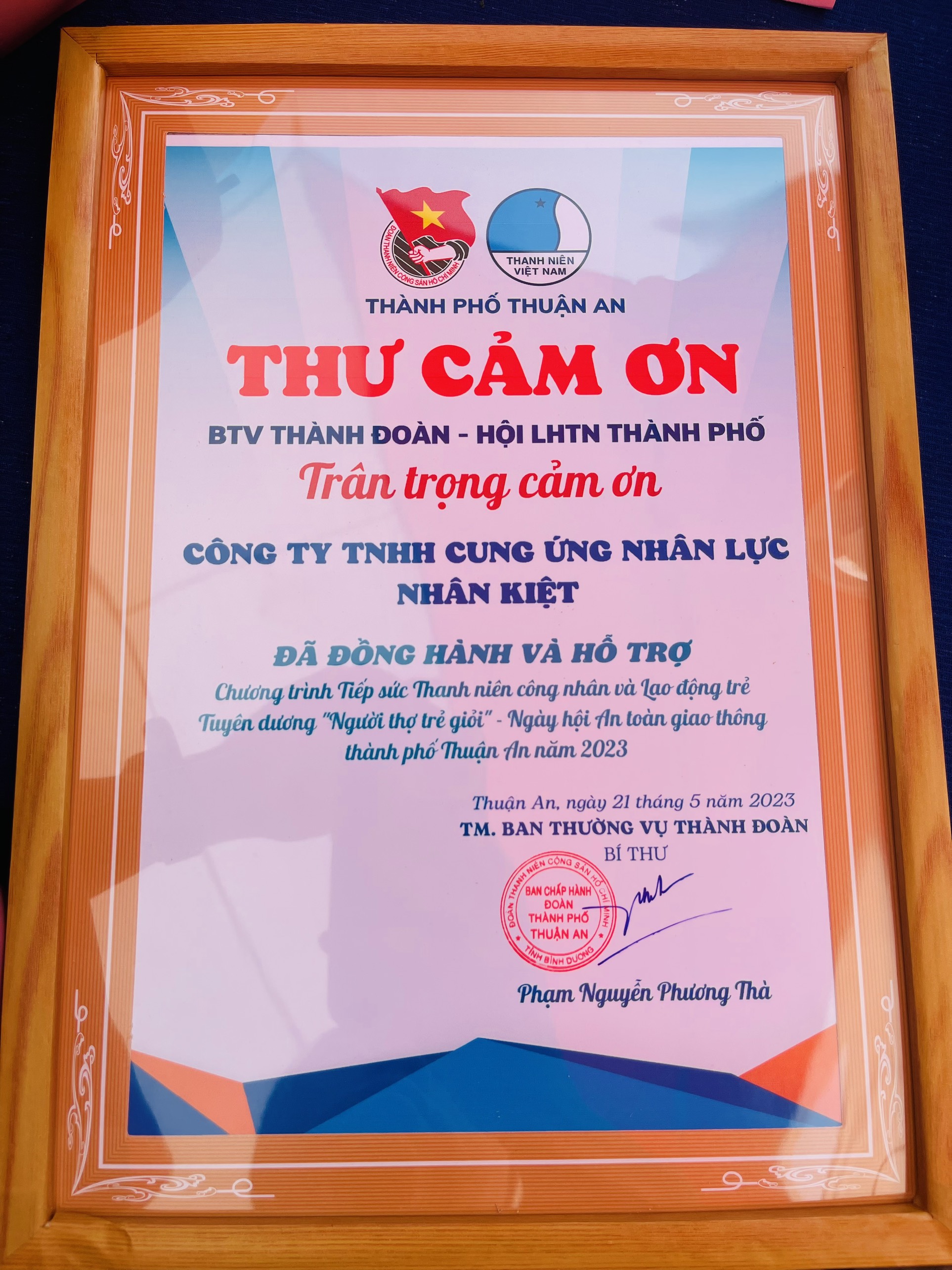 Ngày 21/05/2023, Công ty TNHH Cung ứng Nhân lực Nhân Kiệt đã đồng hành và hỗ trợ Chương trình "Tiếp sức Thanh niên công nhân và lao động trẻ. Tuyên dương "Người thợ trẻ giỏi" - Ngày hội An toàn giao thông thành phố Thuận An năm 2023 do ban thường vụ Thành đoàn và Hội Liên hiệp Thanh niên Thành phố Thuận An phối hợp tổ chức.