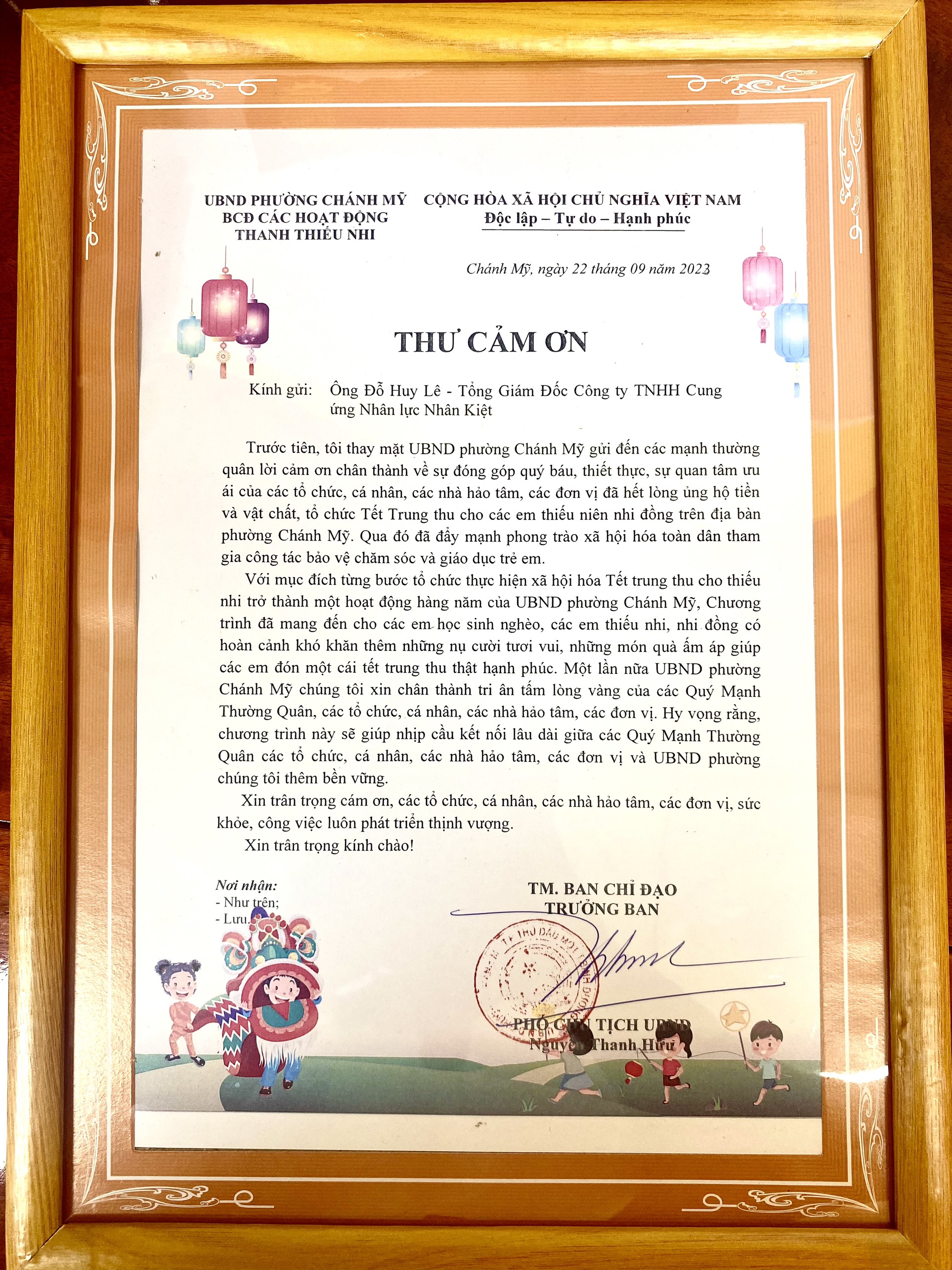 Tại Chương trình, Công ty Nhân Kiệt đã ủng hộ 10.000.000 đồng để mua các phần quà cho các em thiếu niên, nhi đồng. Giúp các em có một Tết Trung thu ấm no, hạnh phúc, ấm áp, vui chơi thoải mái, phát triển bản thân, giao lưu và học hỏi.