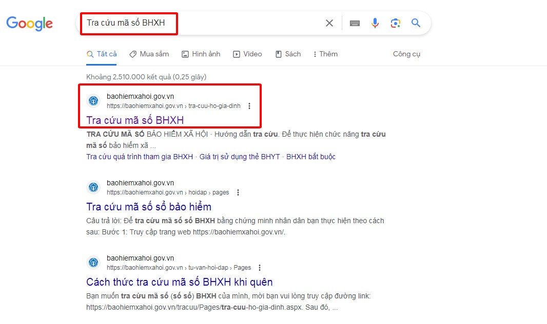 Bước 1: Chúng ta vào Google và gõ “Tra cứu mã số BHXH”, tiếp đó ta vào trang: Bảo hiểm xã hội Việt Nam (baohiemxahoi.gov.vn)
