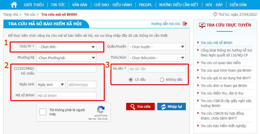 Bước 3: Nhập các thông tin được yêu cầu để tra cứu mã số BHXH. Trong đó: