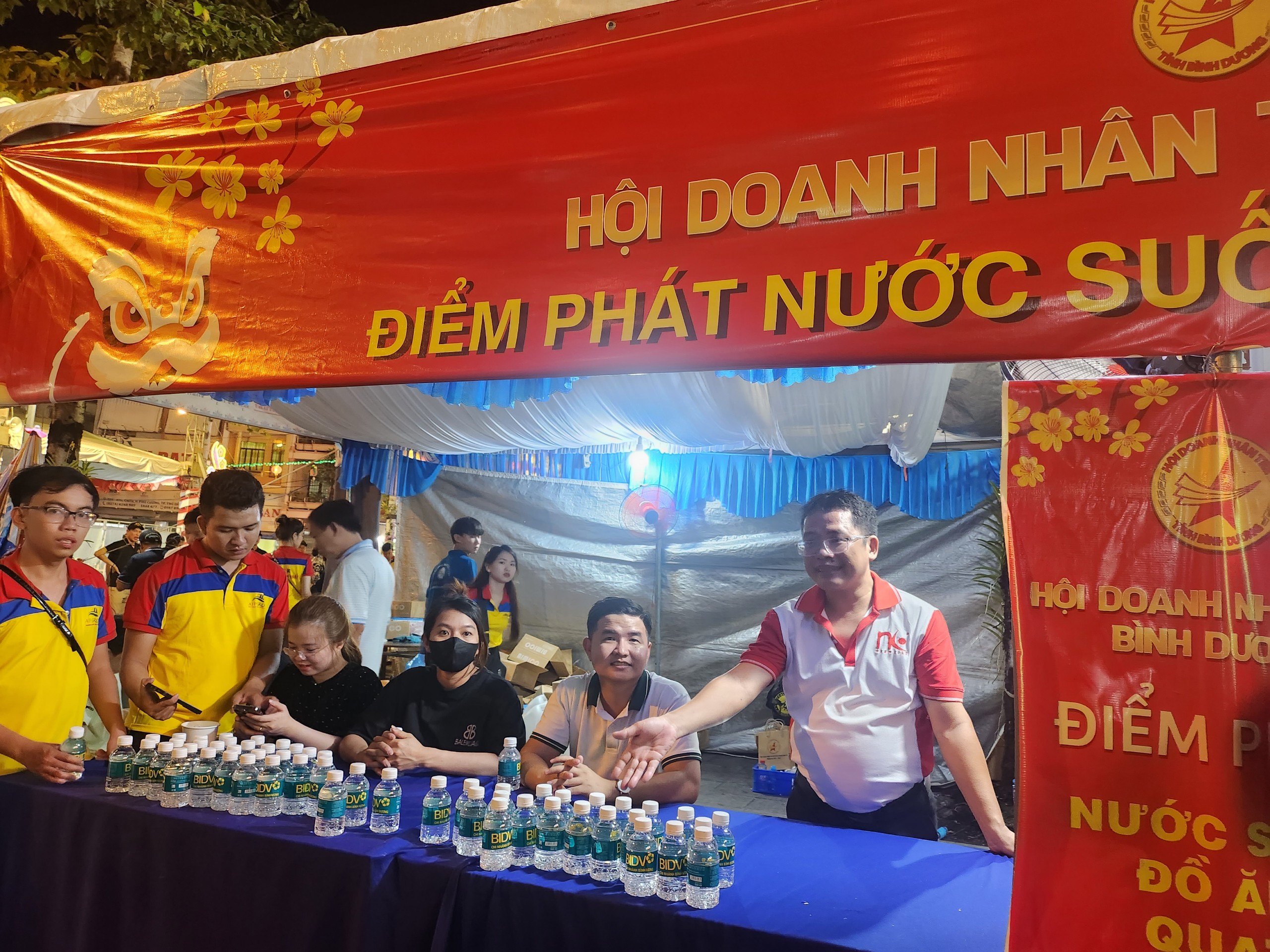 Trong không khí náo nhiệt và trang trọng của lễ hội, hoạt động phát nước từ thiện diễn ra ý nghĩa và thiết thực. Hoạt động lần này được phối hợp giữa Hội doanh nhân trẻ Tỉnh Bình Dương và các doanh nghiệp trên địa bàn tỉnh. nhằm góp phần mang đến sự thanh mát và niềm vui cho người dân tham dự lễ hội. Các điểm phát nước được bố trí dọc theo tuyến đường rước cộ, đảm bảo cung cấp nước đầy đủ cho người dân.Ngoài phát nước suối miễn phí còn có thức ăn, khăn lạnh và quạt miễn phí phục vụ du khách thập phương, lực lượng bảo vệ an toàn lễ hội.