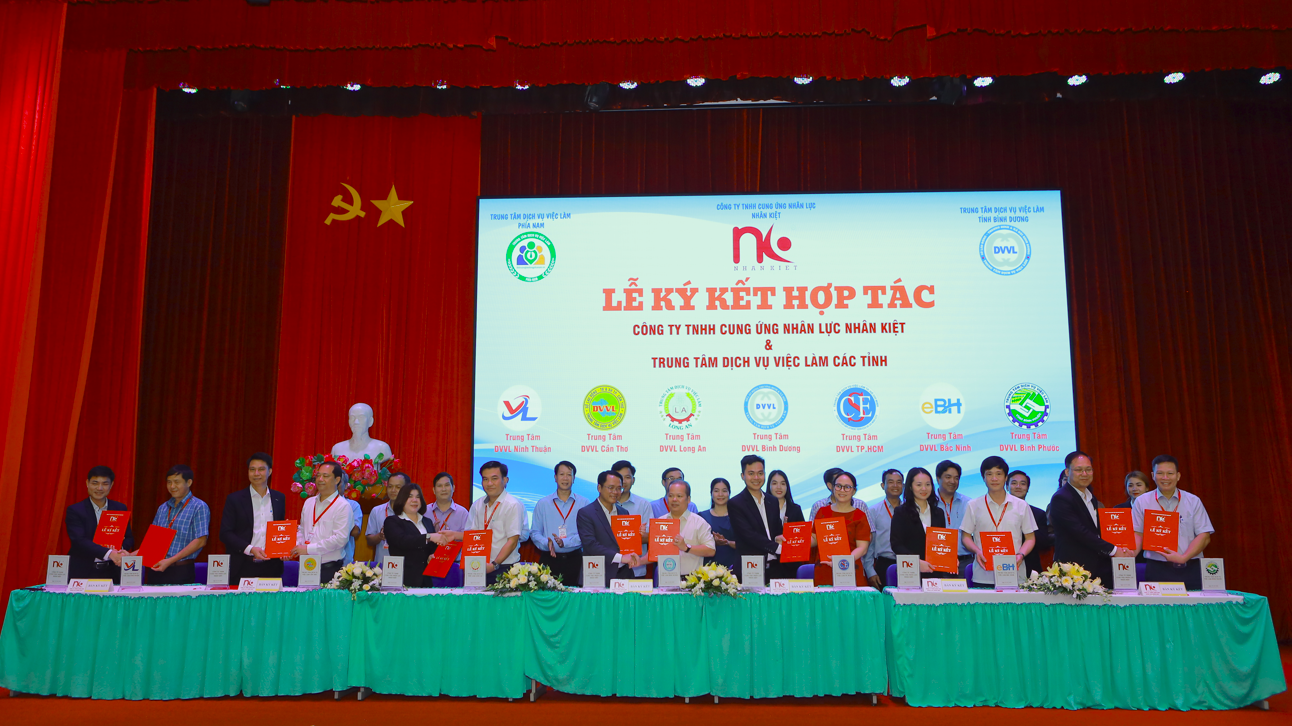 Trong khuôn khổ sự kiện, Công ty TNHH Cung Ứng Nhân Lực Nhân Kiệt đã chính thức ký kết biên bản hợp tác với 7 Trung tâm Dịch vụ Việc Làm nhằm mở rộng cơ hội tuyển dụng và tối ưu hóa quy trình kết nối lao động: